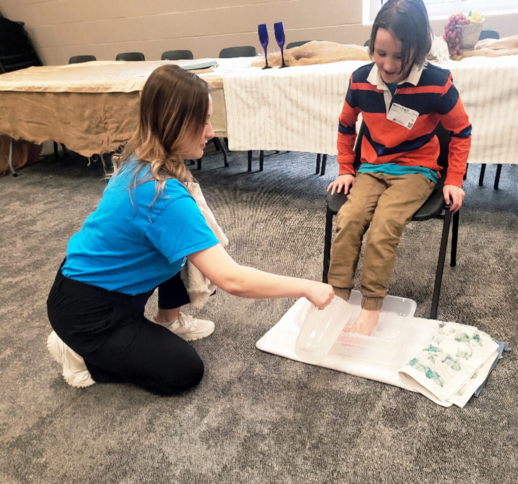 The children moved through 4 stations, to hear the scripture, and participate in a connecting activity. The first station was the Lord’s Supper, with a foot washing experience.