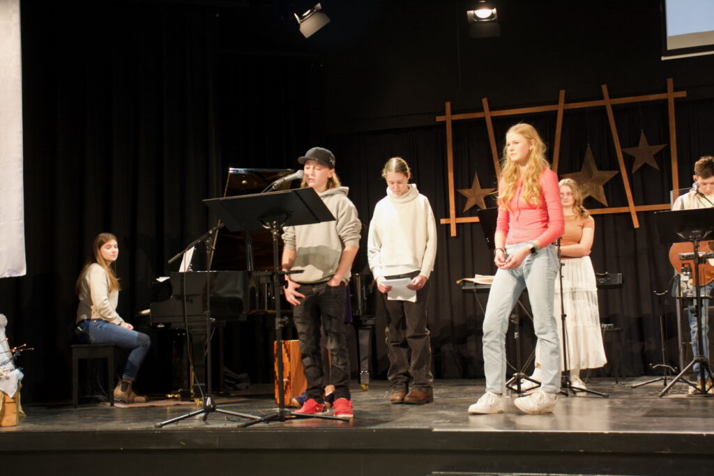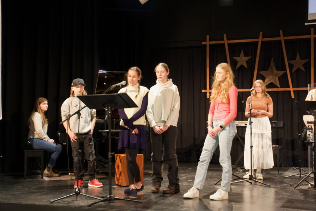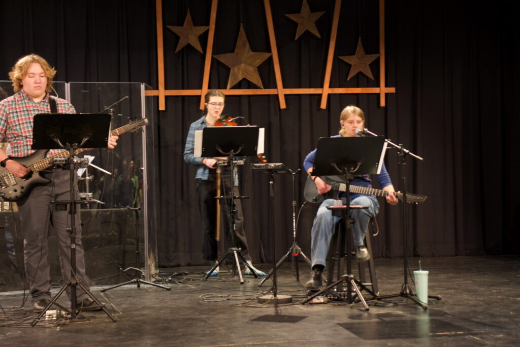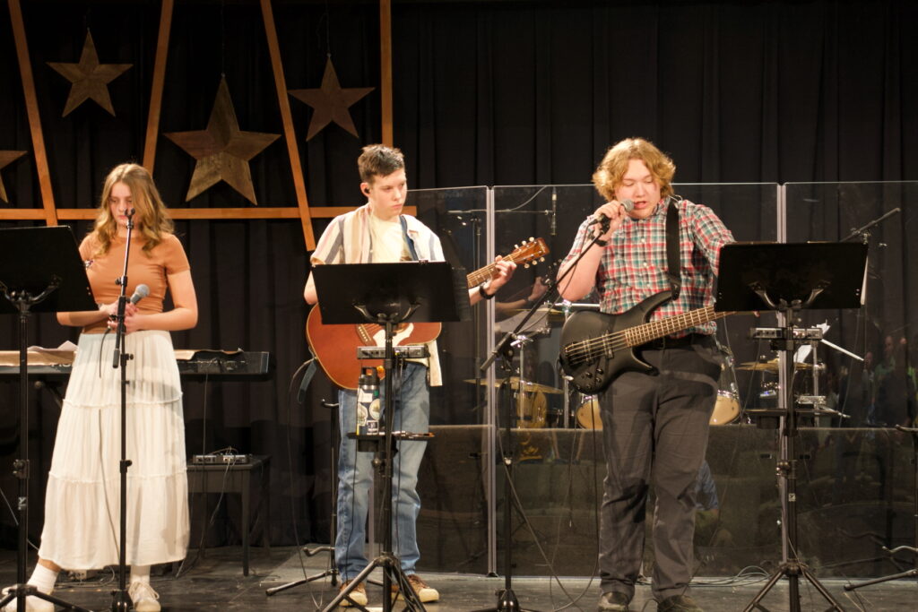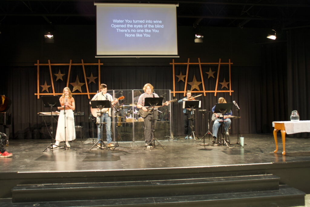 Alexa, Charis and Nathan led the singing, Landon on bass, Micah and Shein on drums, Alaina on violin, Briella on piano, Charis on electric guitar, and Nathan on guitar.